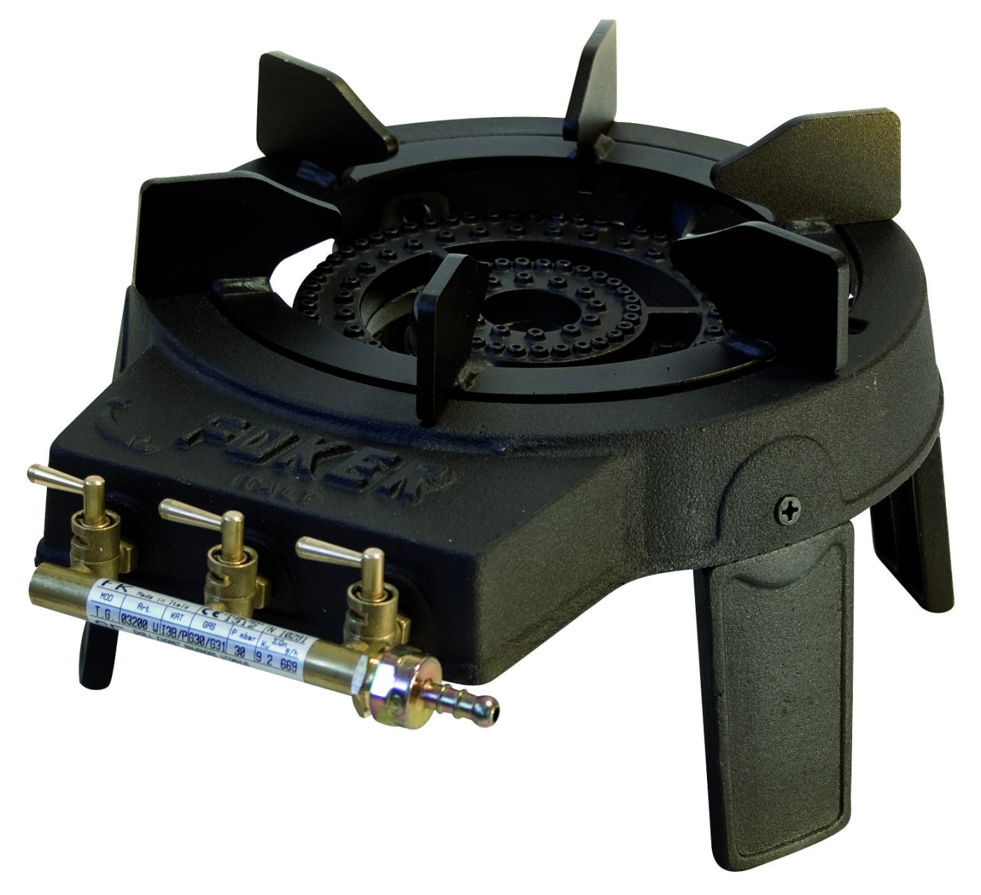 1 pits kooktoestel met grote ringbrander en wokhouder. Regelbaar met drie afzonderlijke regelkranen. Werkzaam op propaan/butaangas 30 mbar. Capaciteit 9,2 kW. Verbruik 670 gram per uur.