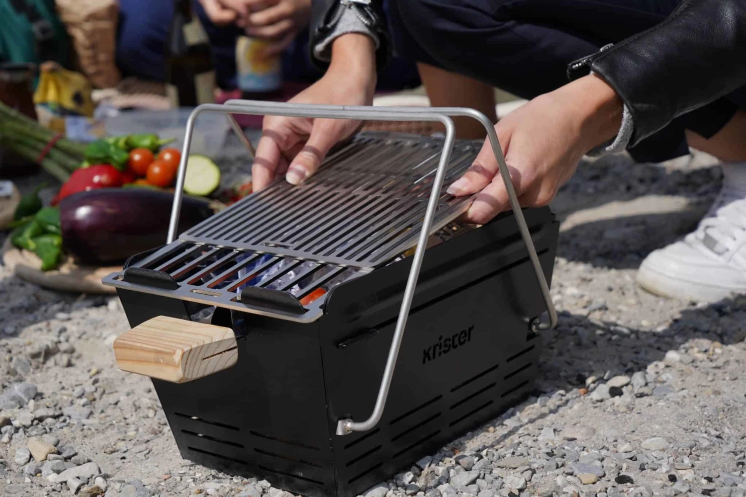 De Knister biedt tijdens het transport ruimte voor bijvoorbeeld kolen, voedsel of servetten. Eenmaal op de grilllocatie aangekomen pak je alles uit en kan je de Knister Grill uitschuiven tot tweemaal de maat. Hierdoor kan je voor 3-8 personen barbecueën.