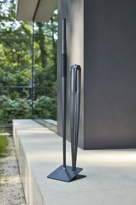 Verkrijgbaar in bruin en zwart gecoat staal met bruine en zwarte leren grepen.